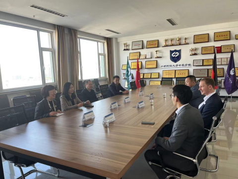 随后,学院领导会见了海蒂诗(Hettich)(上海)公司总经理Daniel Giesselmann一行3人,刘臣洲书记代表学院对Daniel Giesselmann总经理一行表示热烈的欢迎,对为公司即将毕业员工所做的职业生涯规划讲座表示衷心的感谢。史贞经理介绍了学院的发展历程及基本情况,希望未来双方能够加强全方位合作,为员工实习就业搭建平台,为校企双方合作共赢打好基础。Daniel Giesselmann总经理非常感谢学院的诚挚邀请,他表示学院培养既懂语言,又懂专业,有国际化背景的毕业生,是他们企业以及其它跨国企业所青睐的人才。并表示未来希望可以进一步加强合作,加强沟通,助力公司国际化人才培养。