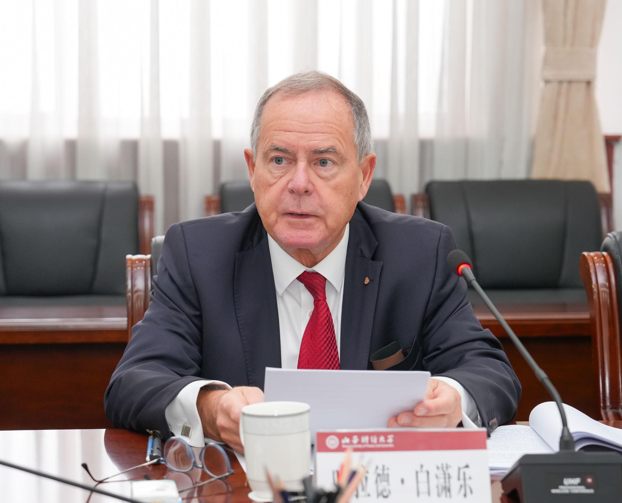 Harald Beschorner董事长在致辞中表示,面对全球形势变化,高校如何应对人工智能技术?我们如何帮助员工适应不断变化的就业市场?面对这些问题,FOM大学将保障和持续提升教学质量,开设具有前瞻性的课程,采取数字化教学模式,持续选派高水平教师赴本项目授课,为学院发展注入新动力,提升员工的竞争力。同时,积极探索两校合作发展的新思路,共同申请建设新的专业课程,共同培养研究生,不断开展联合科研项目以及跨文化语言交流项目等。希望通过双方持续稳固、战略明确且面向未来的合作,加强两国外交和经济关系,积极树立国际合作的典范。