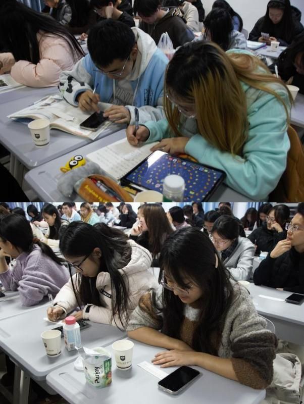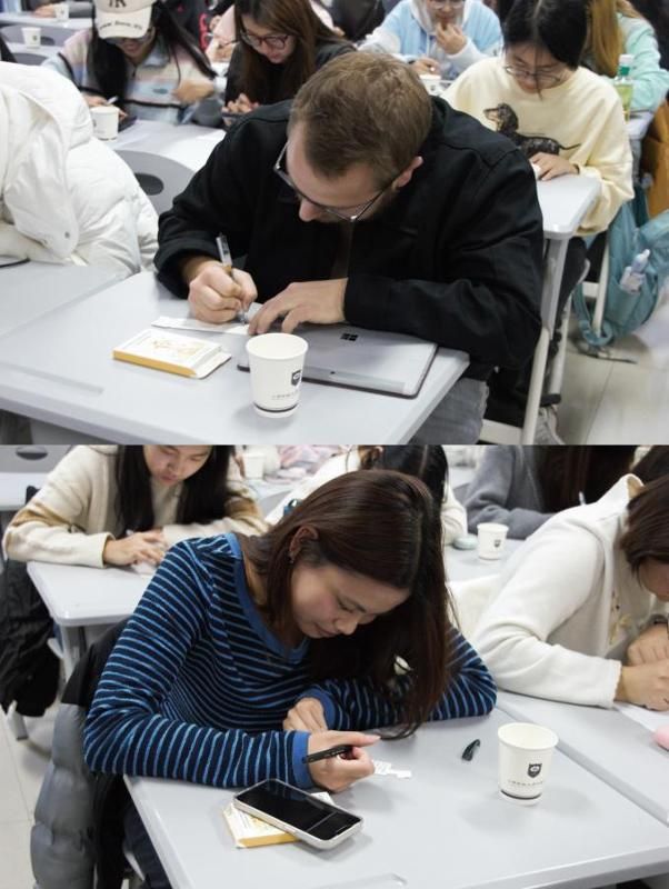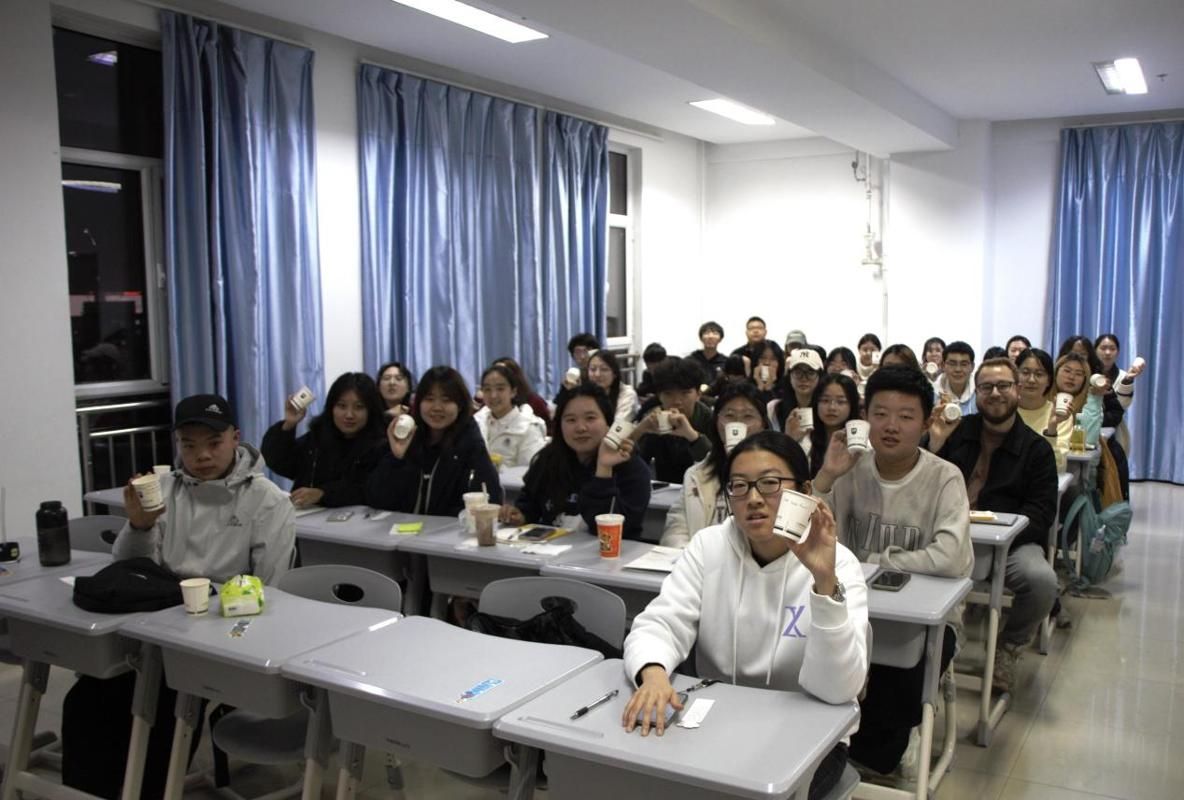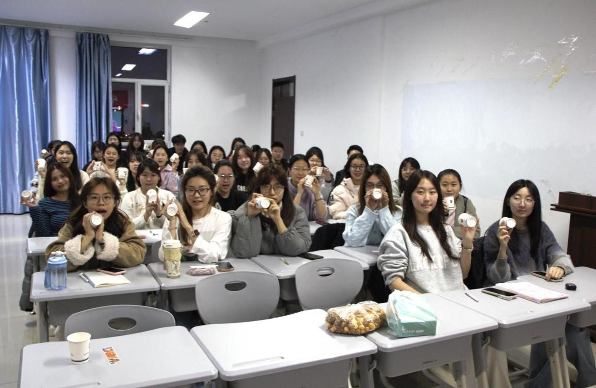 紧接着是具有仪式感的目标制定环节。每位同学都在下发的纸杯上写下了自己新年目标,一笔一划,都是对自己的期许。随后,王萌莎老师绘声绘色地描述了德语影片中的德语祝福"Einen guten Rutsch!”译为“顺利滑入新的一年”“新年快乐”之意。随后,大家共同在纸杯写下祝福语,并相互展示留影纪念,洋溢着灿烂笑容,定格在充满希望与温暖的瞬间。