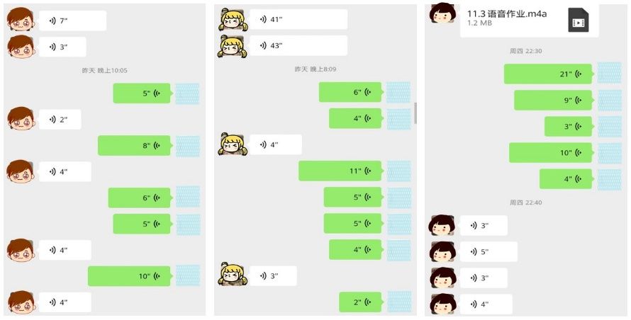 在进行口语和听力练习时,我要求同学们将听力内容转化为对话练习,从而做到听力口语同步训练,并在课后要求员工完成对话作业,通过微信语音发送给我。我会及时收听每一条微信语音,对员工完成出色的部分进行表扬,对需要完善的部分及时提醒。