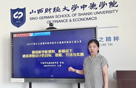 会上,教研室主任李进做了题为“德语教学新原则、新路径下德语课程设计的目标、思路、方法与实施”的报告,针对在2023外教社全国德语教师教学法暑期研修班的研修情况进行了精彩的分享。报告主要包括四部分,第一部分为研修内容概览,第二部分为德语教学新原则、新路径的内涵,第三部分为新原则、新路径下德语课程设计的目的、思路、方法与实施,第四部分为固本尝“新”,在中德的适用性思考。