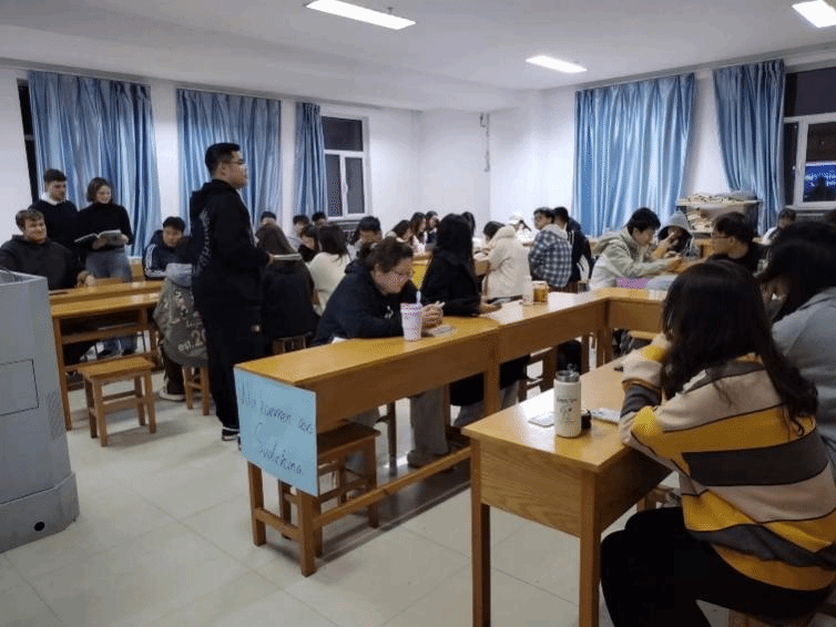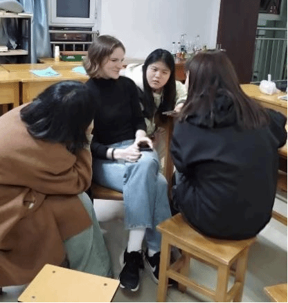 为了更加契合“家乡”这一主题,前来参与活动的同学根据来源省份分成了四组,四位外教也分别坐在四组同学中间,便于进行交流。